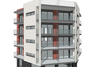 Es proposa un edifici d’obra vista blanca a partir de les plantes pis. Per tal d’emfatitzar més la noblesa del material, aquesta es proposarà sobretot en els trams de façana que estiguin volant per sobre la vorera (tribunes dels habitatges). Continuant encara a nivell de plantes pis, per a les parets de façana que no sobresortint del límit de propietat (enrasades al límit de solar), es proposa un estucat de calç amb pliolite de color vermellós per tal de que amb la seva tonalitat més fosca, ressalti més encara la puresa del blanc de la “caixa” d’obra vista que sobresurt en forma de tribuna. Baranes de vidre i acer inoxidable i fusteries d’alumini lacat color gris fosc, complementarà la resta de materials de façana a partir de planta primera.